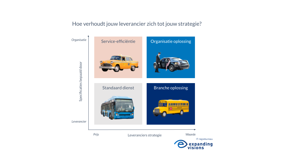 Niet elke leverancier hoeft een strategische partner te zijn. Het is belangrijk om vooraf te bepalen hoeveel invloed je zelf wil hebben, en welke mate van toegevoegde waarde je verwacht. Onderstaand model laat dat op een toegankelijke manier zien: